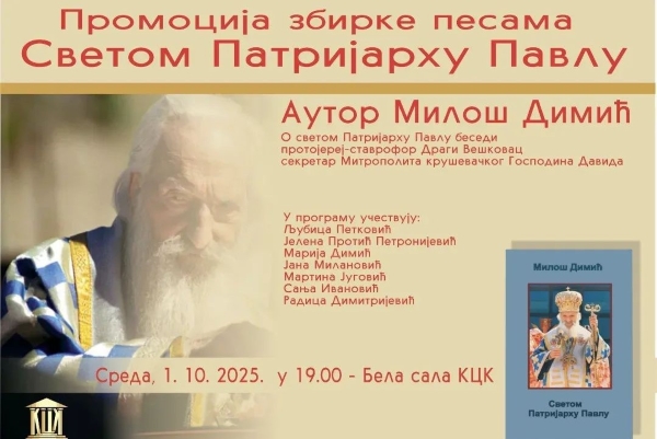 Ove srede (1. oktobra) u Beloj sali Kulturnog centra Kruševac biće održana promocija zbirke pesama koje je napisao kruševački pesnik Miloš Dimić u čast Svetom patrijarhu Pavlu